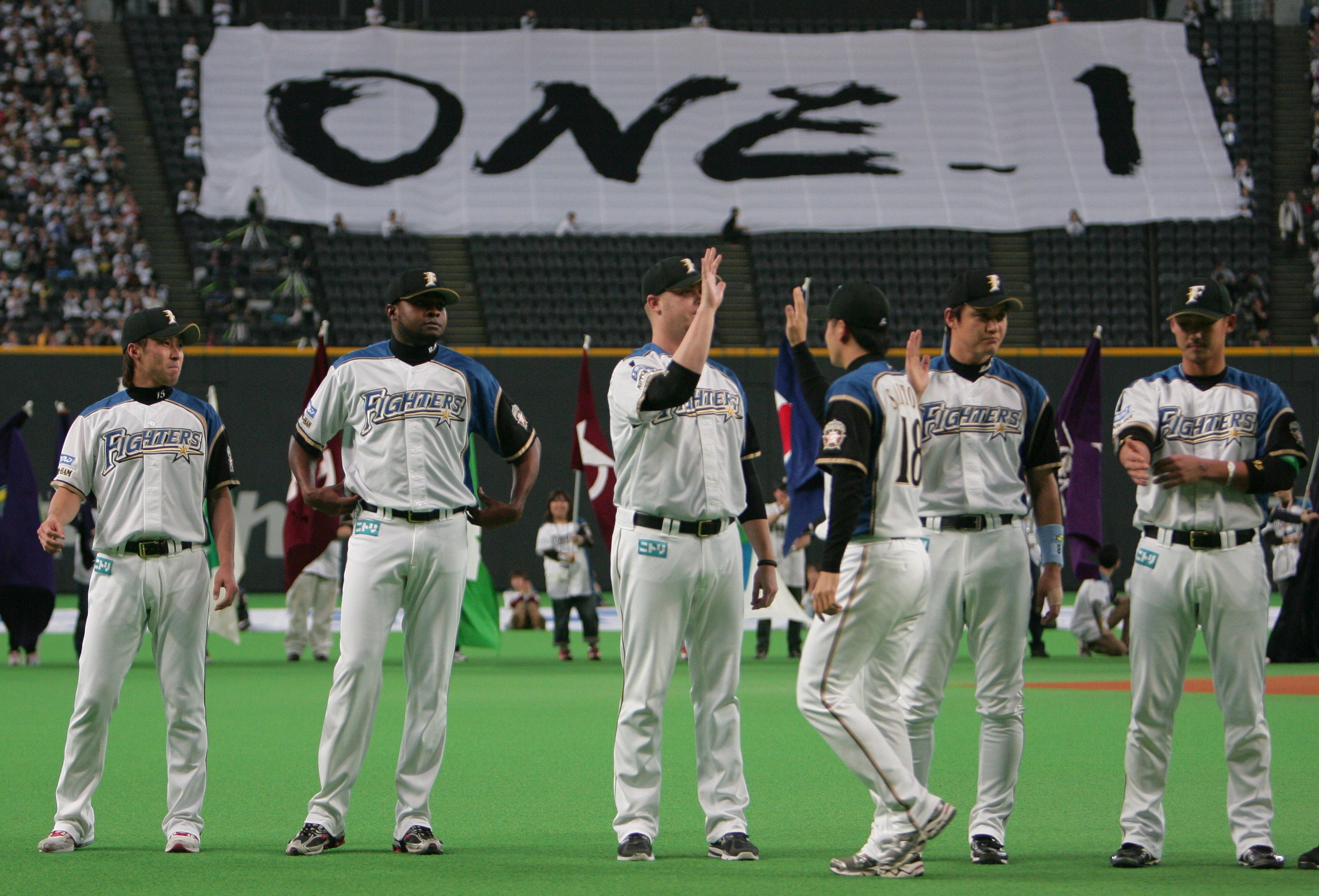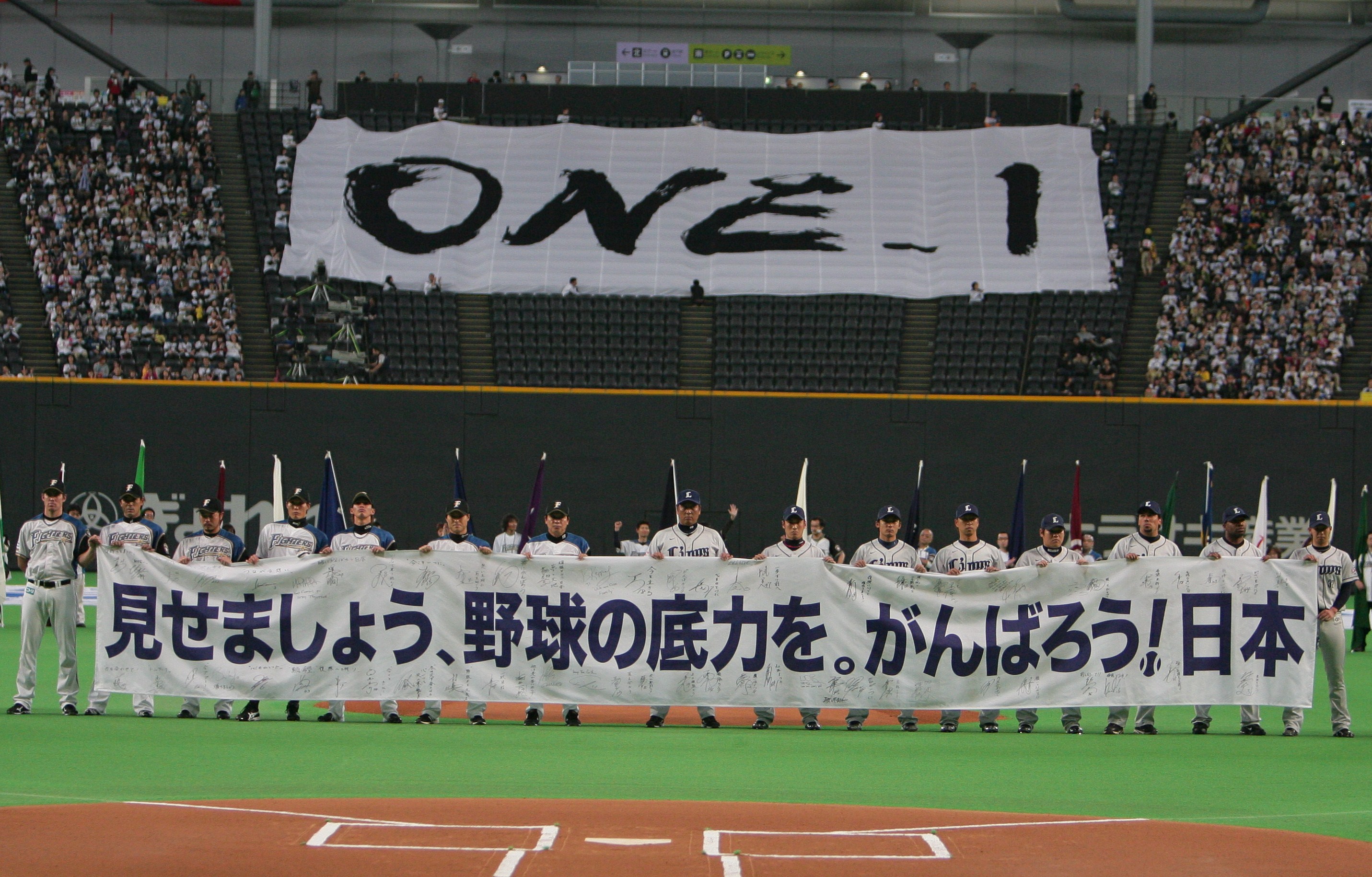 東日本大震災から一ヶ月が過ぎ、延期されていたプロ野球公式戦が4月12日に開幕となりました。札幌ドームではオープニングセレモニーが盛大に行われ、当館顧問で坂本家九代目当主・坂本登氏が執筆した北海道日本ハムファイターズチームスローガン「ONE_1」の力強い文字がバックスクリーン一杯に大型フラッグとして掲げられました。