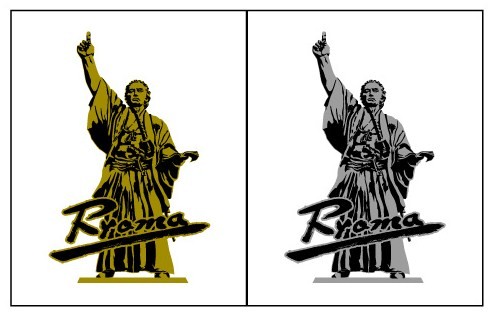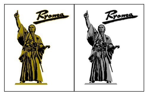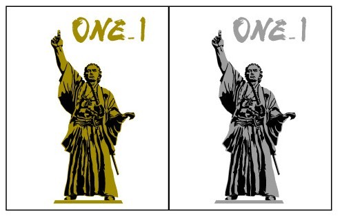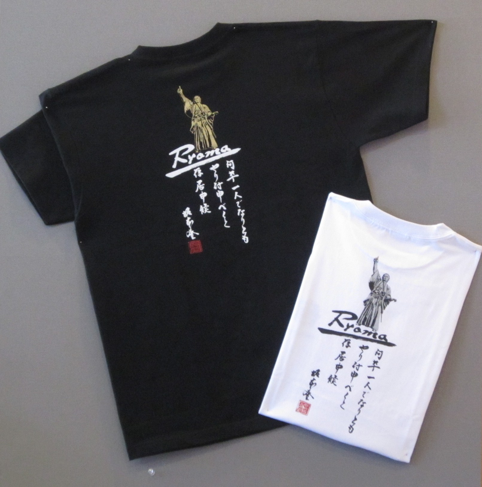 ◎「ONE_1」Tシャツ(左)と龍馬像Tシャツ(右)。サイズはSS、S、M、L、XL、色はブラックとホワイトの2色で価格は2,000円(税別)。