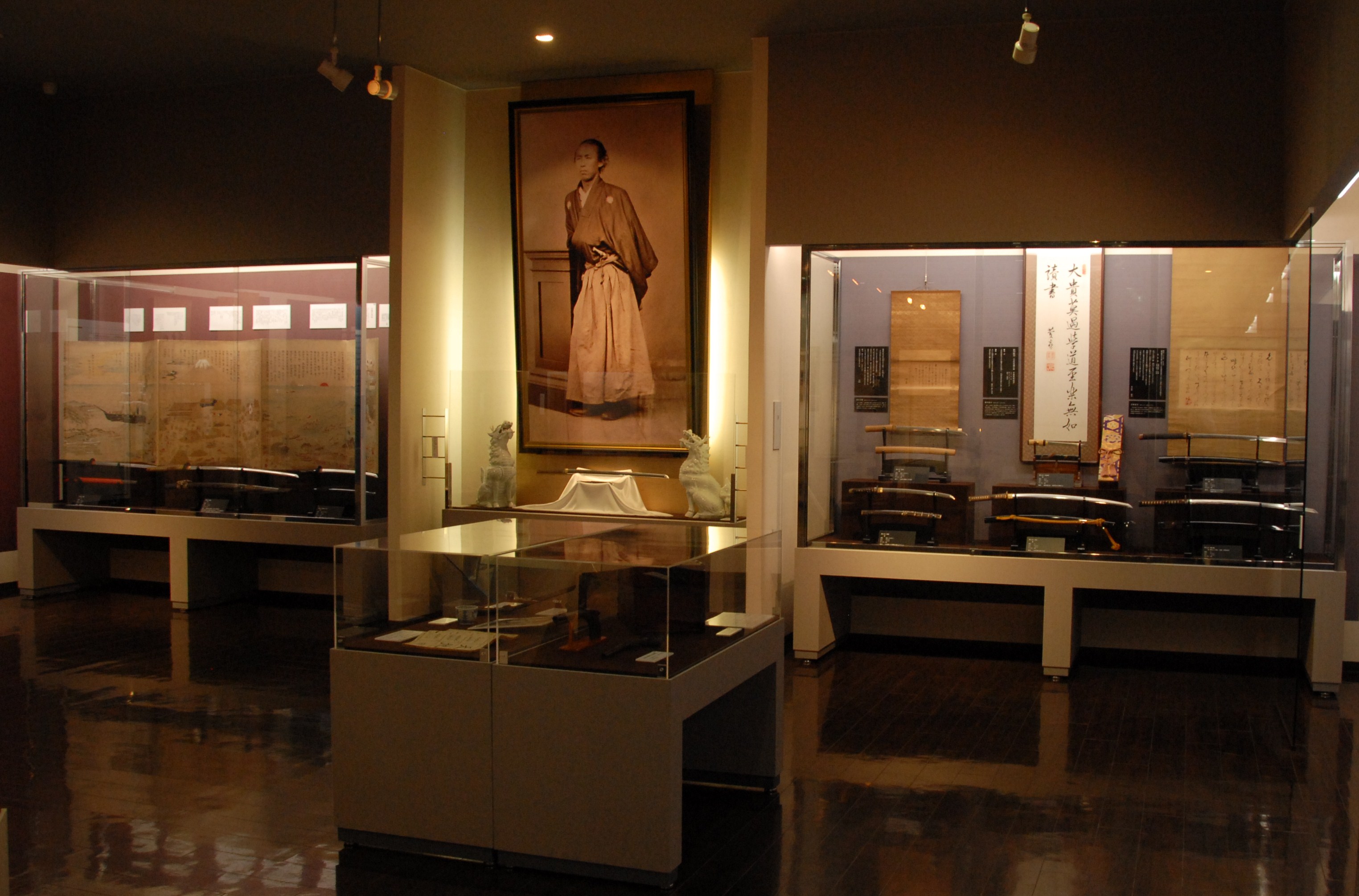 そして、今回のリニューアルの目玉となるのは、江戸時代~幕末動乱期の日本刀の数々。徳川家伝来、水野家の宝物短刀をはじめ、龍馬の愛刀「吉行」と同じ刀工による吉行の脇差、約95㎝もの長さを誇る薩摩薬丸自顕流の大刀、激戦の跡も生々しい会津藩士や薩摩藩士の刀などが並び、動乱の中、命がけで戦った武士たちの想いが、刀を通じてひしひしと伝わってきます。