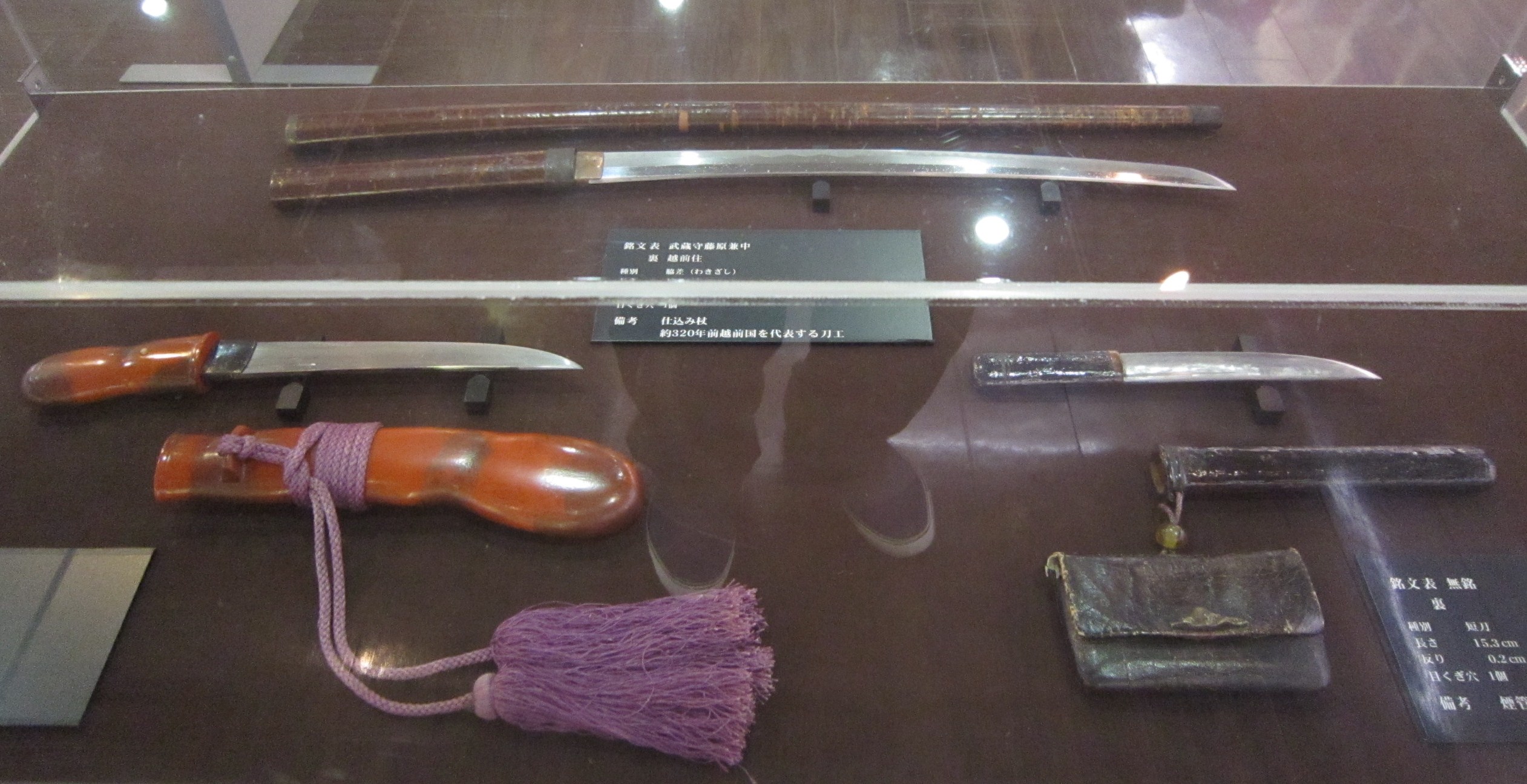 その他にも、桜の木でできた杖(写真奥)、ひょうたん(写真手前左側)、キセル入れ(写真手前右側)などに刀を納めた珍しい仕込み刀など、歴史ファンならずとも必見の刀が新たに十二口加わりました(※刀の正式な数え方は「口」を使います)。