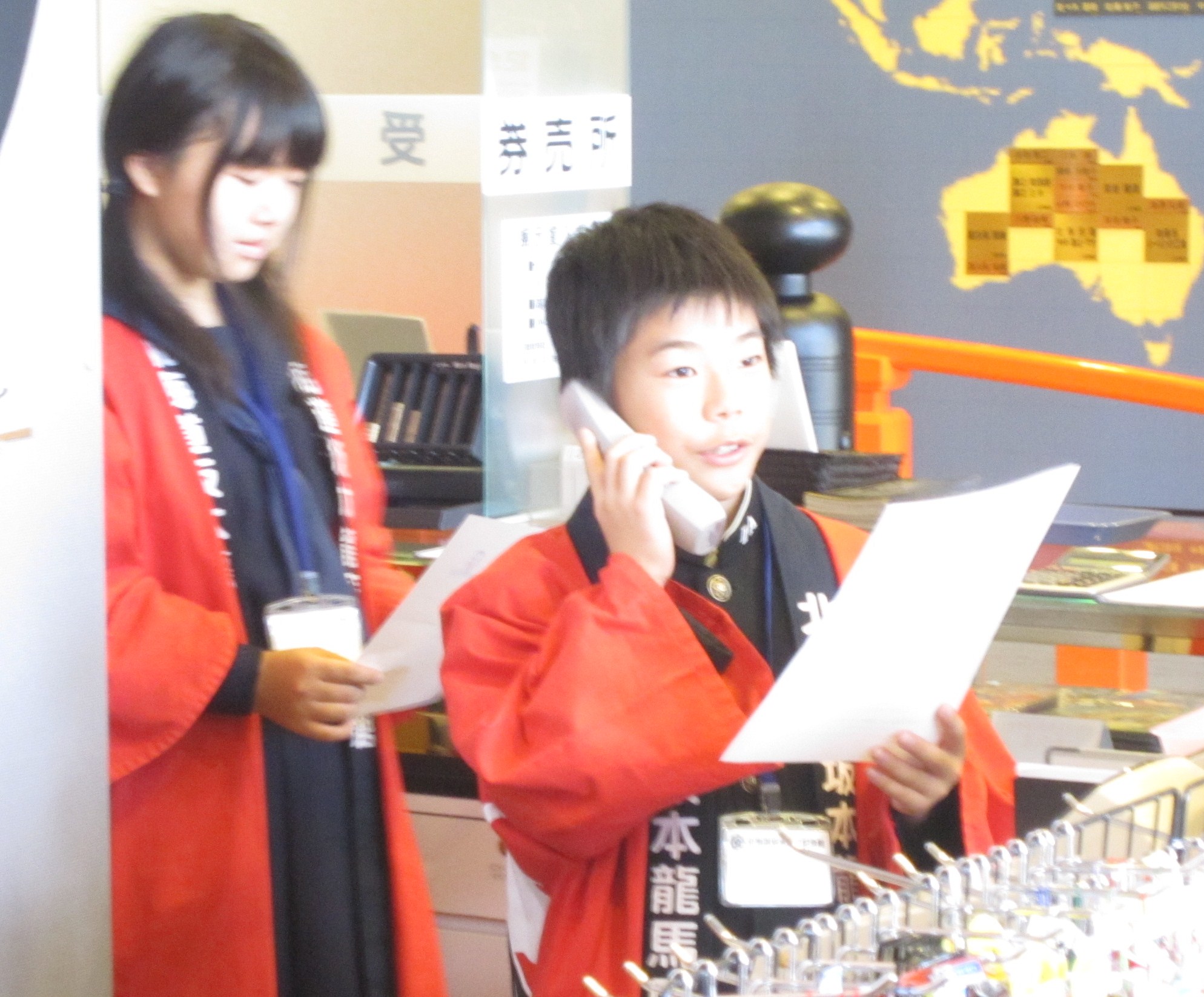 体験学習の内容は、○ガイダンス、○施設の説明と展示室見学、○館内や龍馬公園の清掃、○接客や受付・販売補助、○展示史料解説の体験などを行いました。ガイダンスでは、来館者や観光客の方々への対応の際は、常に相手の立場に立った心づかいを心掛けること、そして、この機会を通じて坂本龍馬や博物館について興味を持ち、学んでほしいといったことを伝えました。
