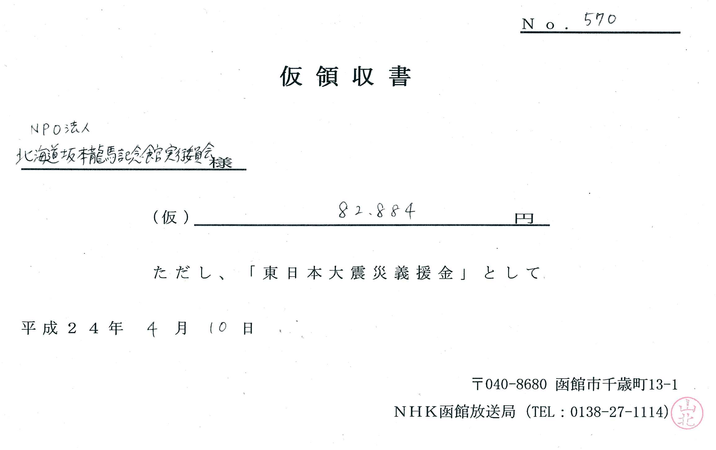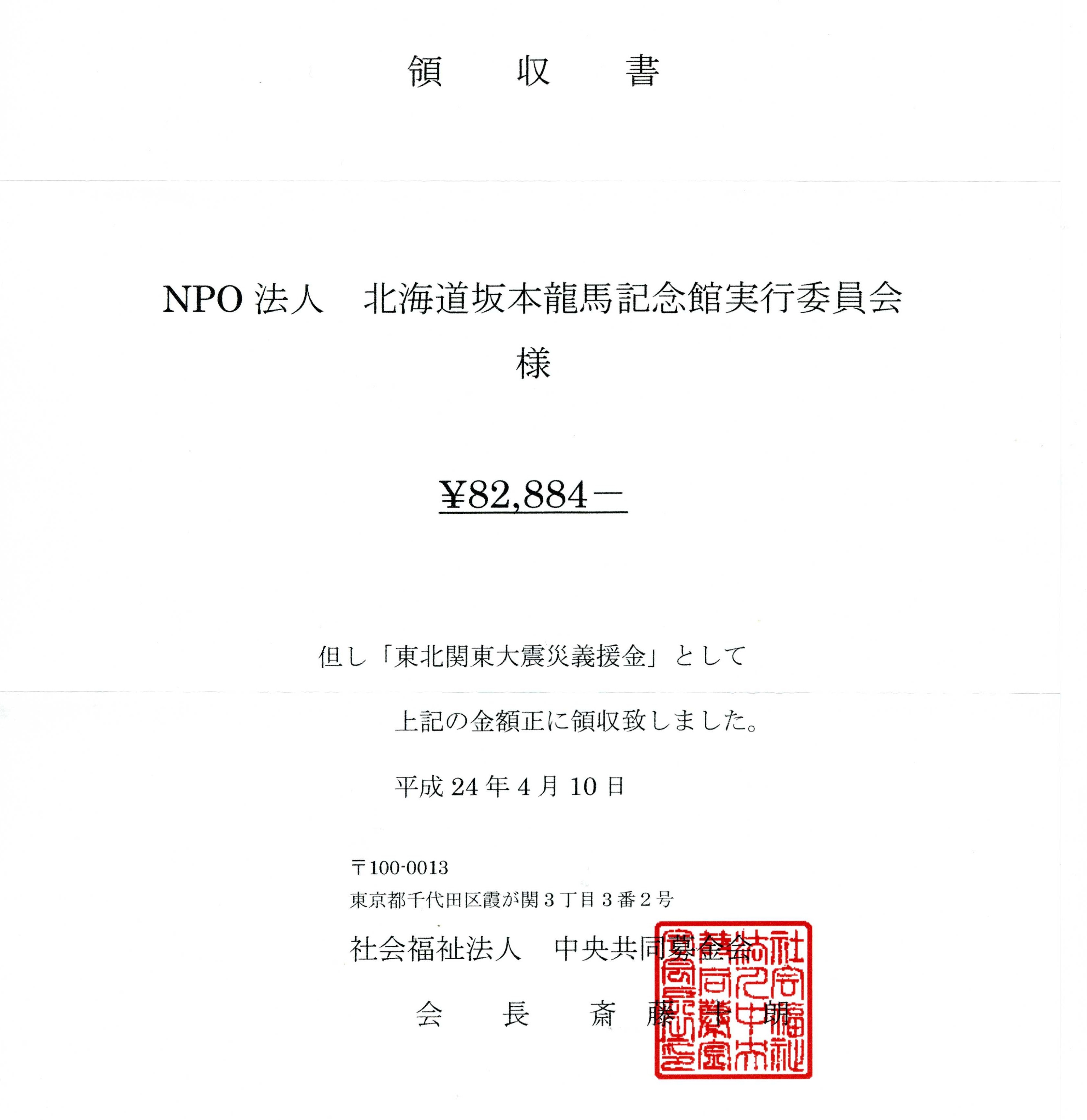 東日本大震災発生直後よりご協力をお願い申し上げてまいりました北海道坂本龍馬記念館内での募金箱及び函館龍馬公園(蝦夷地の龍馬像前)での募金活動などで皆様からお預かりした暖かい募金に加え、函館社中の収益金の一部、当館スタッフや協力者の皆様よりお預かりした義援金は、日本赤十字社苫小牧地区納入分(20、000円/平成23年8月18日)と、NHK函館放送局納入分(82、884円/平成24年4月10日)を合わせ、平成24年3月31日現在で合計102,884円となり、被災地の方々に寄付させていただきましたのでご報告申し上げます。