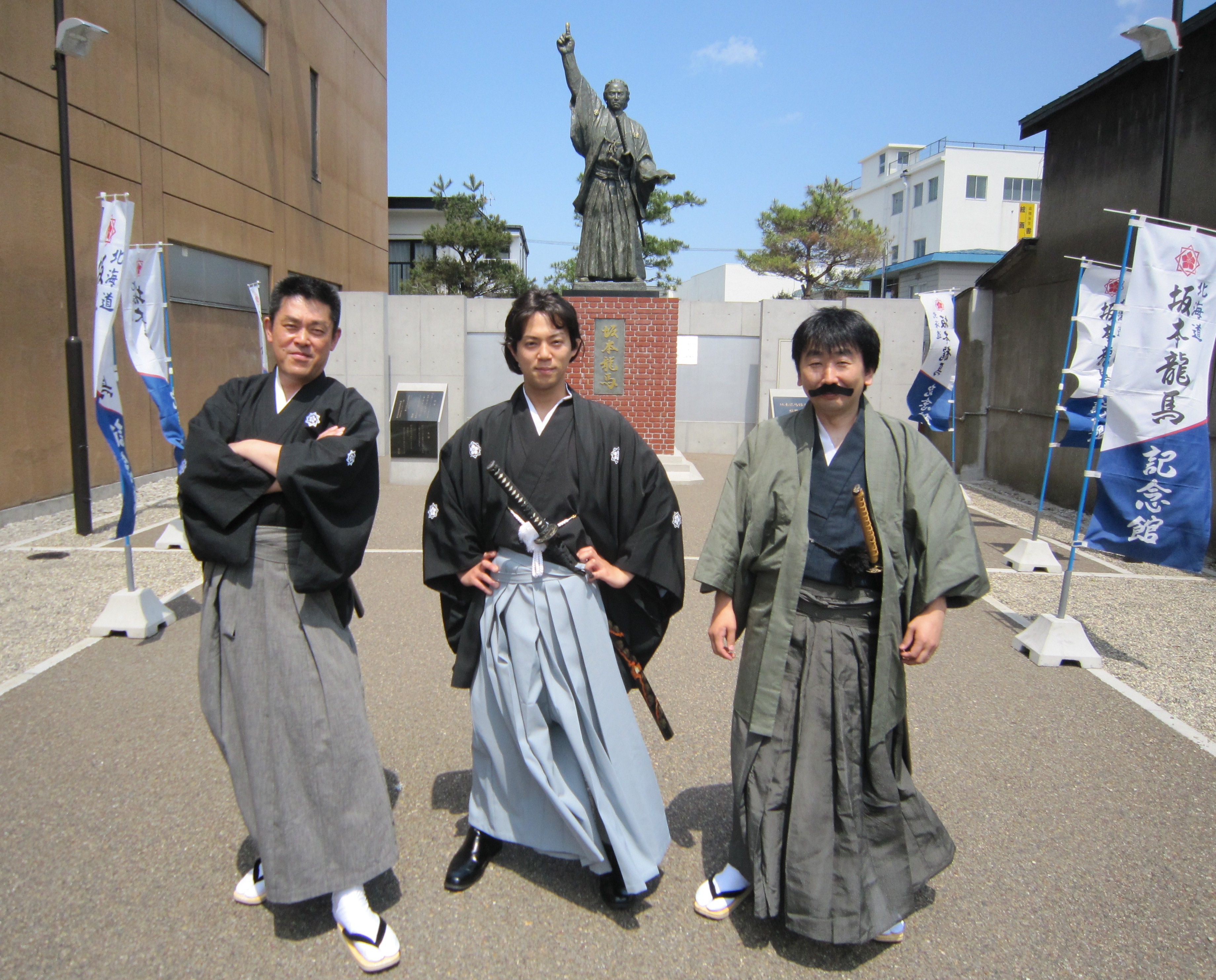 この写真は龍馬像前での出陣式のスナップ。中央が高松太郎(坂本直)役の佐藤慶輔さん、向かって右が岡本監輔役の佐藤強さん、左が山東一郎役の私です。