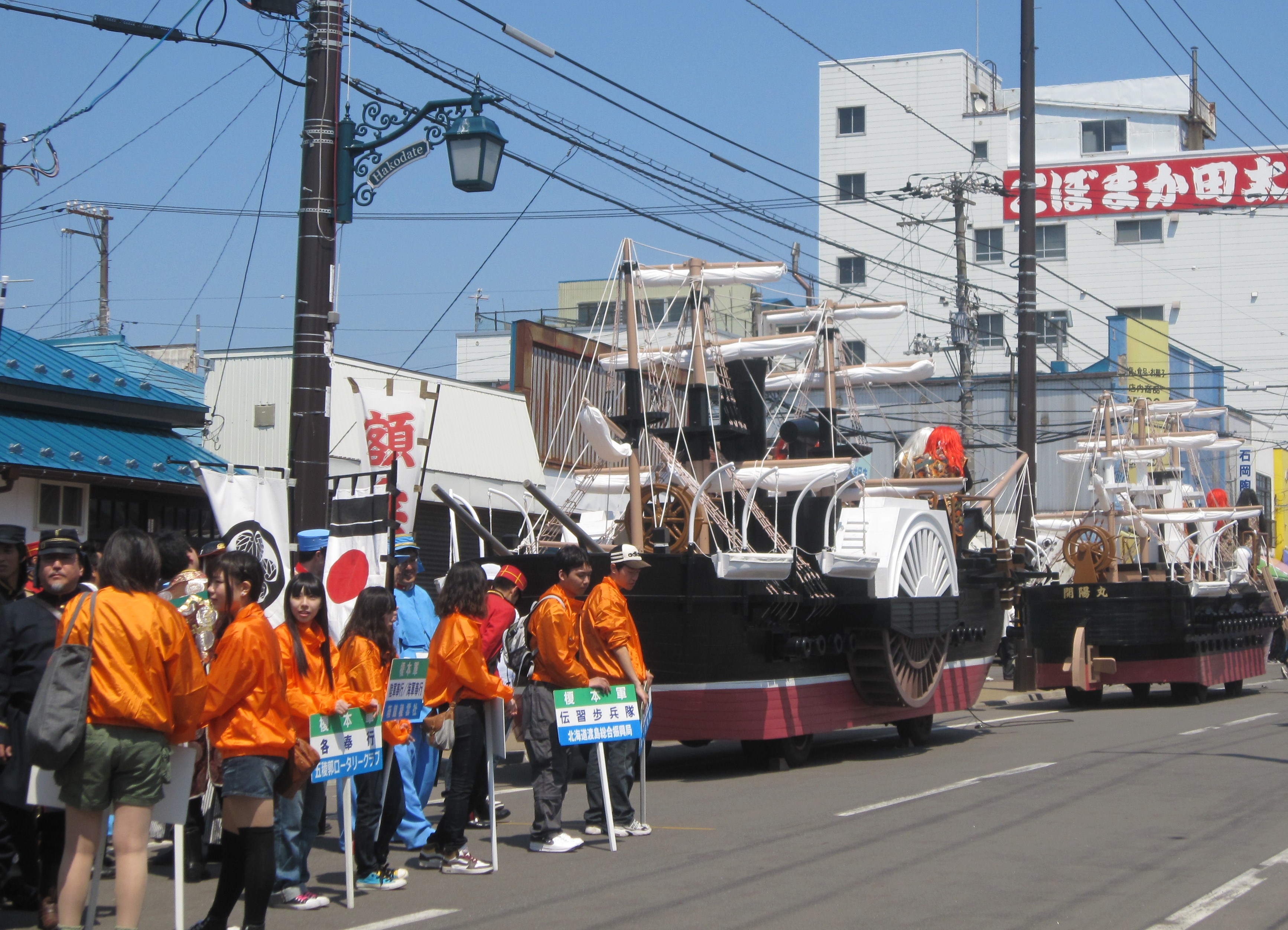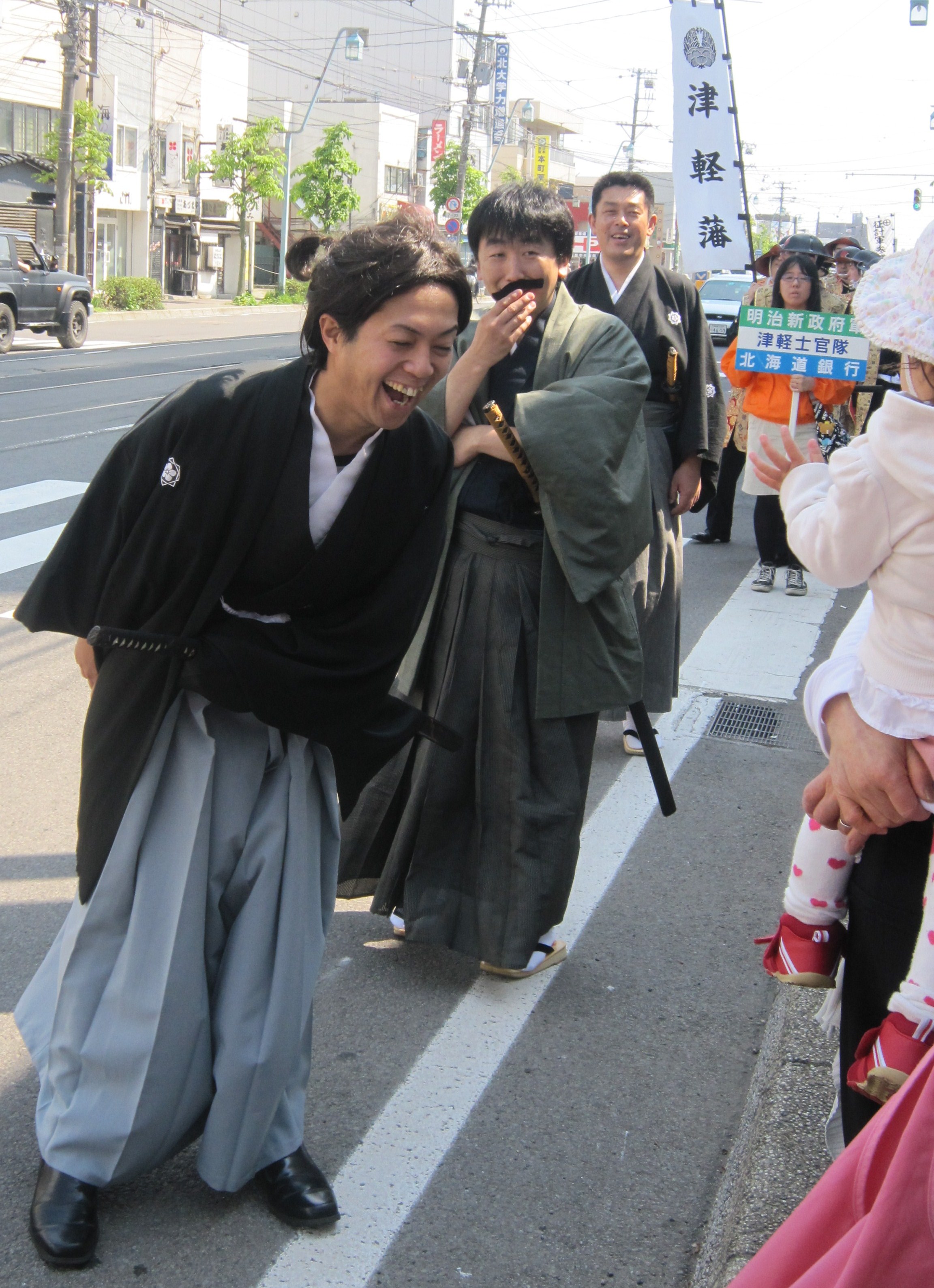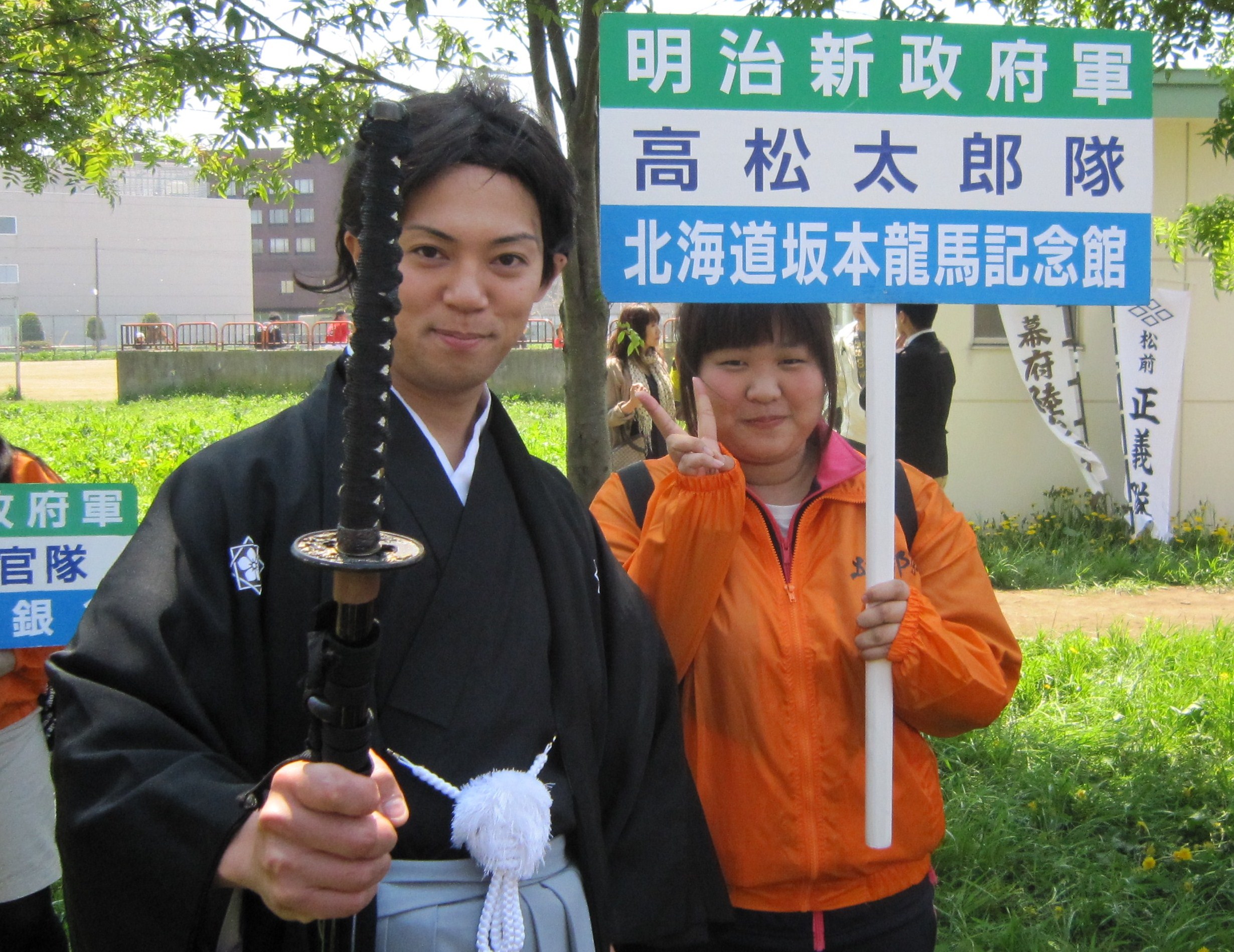 我が北海道坂本龍馬記念館・高松太郎隊は、“北海道に上陸したぜよ!”のセリフやアクション、そして沿道の観客や電車・バスなどで移動中の人々に手を振ってPR、多くの方々が反応し、声援を送ってくださいました。