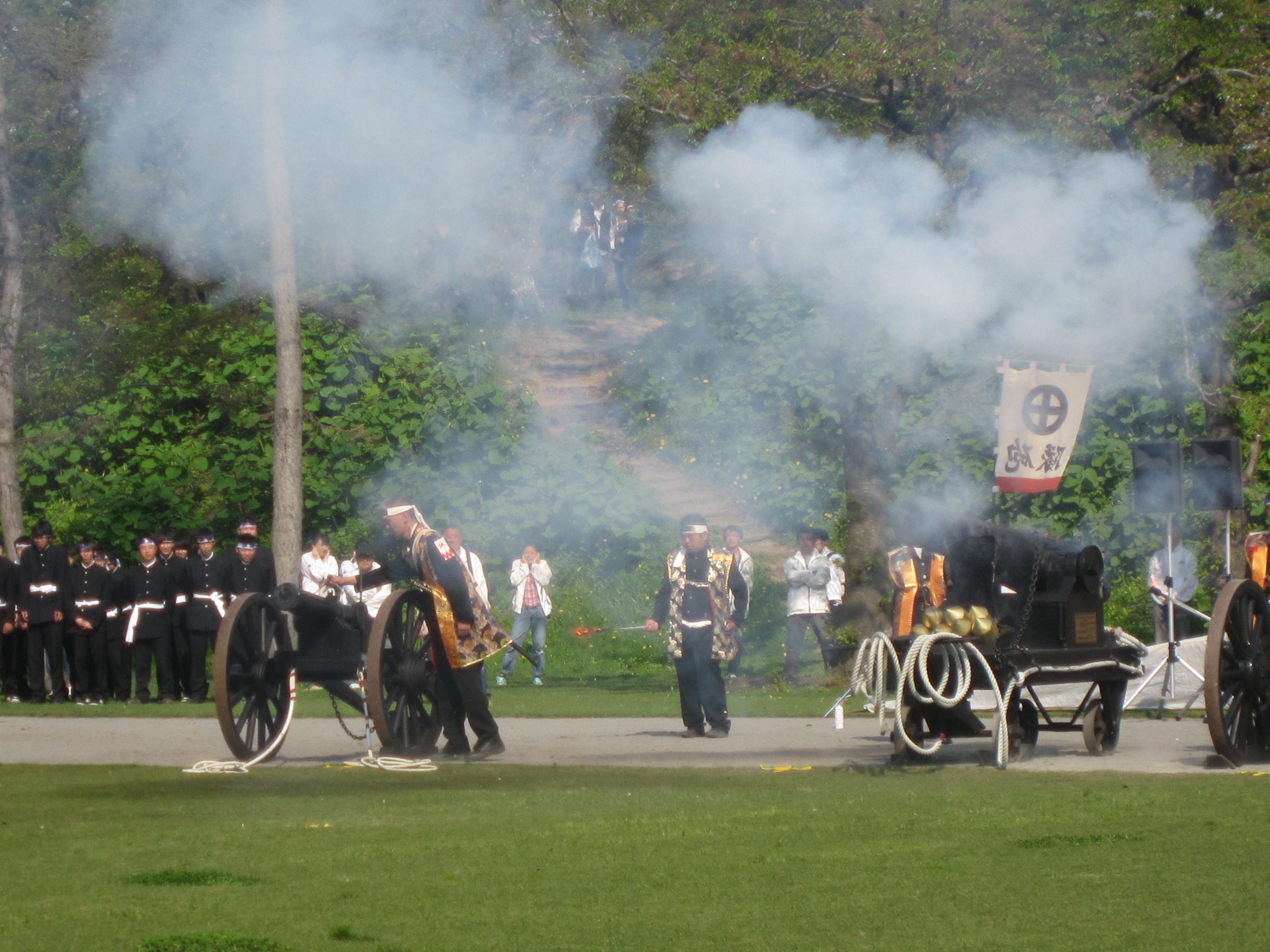 そして、五稜郭公園内では、フィナーレとなる「開城セレモニー」が行われました。北海道警察と陸上自衛隊の音楽隊による演奏、榎本武揚から黒田清隆への五稜郭明け渡しの会談(寸劇)、開城宣言、銃と大砲による祝砲、函館観光大使・平田まりさんによるオリジナル曲『五稜の夢』の披露、実行委員長・中野豊氏の挨拶と続き、最後は賑やかな餅まきをもって全ての催しが終了しました。